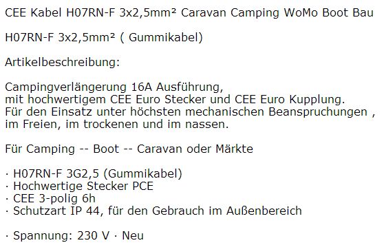 ciao a tutti, devo sostituire la prolunga di allacciamento elettrico del camper. Da un rivenditore di materiale elettrico ho trovato un cavo, già completo di prese cee maschio e femmina, lungo 25 metri e da 2,5. Il cavoè grigio e riporta stampata questa scritta: 3826 F GENERAL CAVI ECOFLEX Pb froc CEI 20-22 II IEMMEQU FROR-450/750U 3G2,5 0773/15 G06/3/M09/L10/7109 Per chi ne sa, è a norma per il nostro uso (Non c'è la scritta H07RNF) Grazie per le risposte. William
