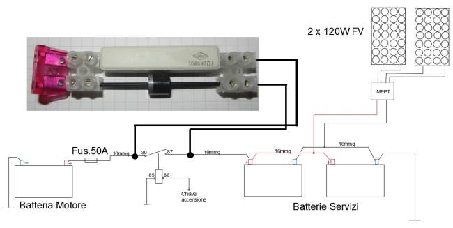 Tommaso, lascia stare il contenitore di plastica che poi, come giustamente hai scritto, dovrai forare per aerare. Dopo averne fatti una decina la soluzione, a mio avviso, più semplice è la seguente. 2 mamouth classicie un fusibile modificato. Bisogna ridurre le lamelle tagliandole. 2 pezzi di termorestringente sul diodo. Se vuoi esagerare metti un rettangolo di plexiglass di protezione sopra e usi i due fori centrali dei mamouth per fissare il tutto. Peso 18 grammi , costo irrisorio, resa tanta. L'ideale e metterlo vicino al relè parallelatore dove trovi sia il BM+ e il BS+