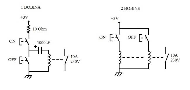 Quasi... Un rele' bistabile puo' funzionare con due avvolgimenti o anche con uno solo invertendo il senso della corrente nell'avvolgimento. Questo ovviamente in linea generale ma ci si puo' aspettare altro... Il sistema cheho disegnato io funziona con l'inversione della corrente, essendoci i diodi, in senso una bobina e' bypassata dal un diodo, nell'altro senso e' l'altra bobina che e' bypassata. E' ovvio che con le due bobine in serie senza diodi, il campo magnetico generato e' lo stesso di una sola bobina a 12V ma la resistenza e' doppia, per cui mezza corrente, mezza capacita' ecc.. Ti metto un'altenativa transistorizzata per interrompere un positivo a 50mS circa rigorosamente teorica. Renzo.