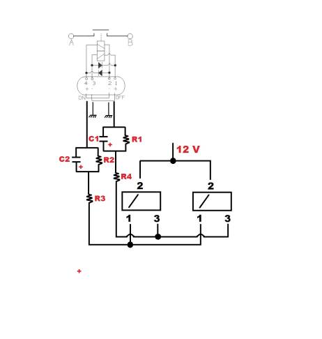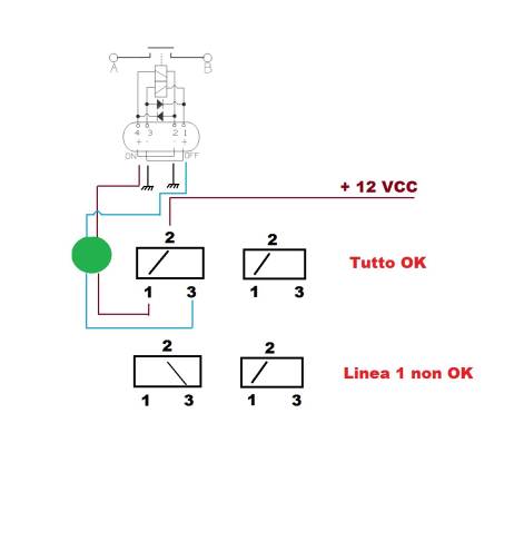 Da una parte ho due relè con ognuno tre morsetti. Quando tutto è nei valori stabiliti ho il morsetto 1 e 2 che hanno il circuito chiuso mentre il 2 e 3 aperto. Quando si verifica un'anomalia si apre il collegamentotra 1 e 2 e si chiude quello tra 2 e 3 . Devo utilizzare questi due relè a 3 contatti per gestire un relè bistabile TYCO 2505 ... Se non ho capito male questo relè bistabile ha due bobine che spostano il contatto quando ricevono un' impulso di corrente con tensione da 12 V. Chiude quando l'impulso arriva sul 4 e apre quando arriva sul 1. Impulso che deve essere compreso tra 100 ms e 500 ms . Collegando una +12 ai morsetti 2 dei relè a tre connettori posso mandare la tensione al relè bistabile sul morsetto 4 o 1 in base al suo stato ma dovrei interrompere il circuito dopo 0,5 secondi . Devo interporre un circuito se possibile molto semplice ( evidenziato dal punto verde ) che mi apra il circuito dopo circa mezzo secondo. Qualche suggerimento ? Grazie