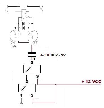 Per Renzo07 .... il Tyco non credo sia apribile per togliere i diodi o interrompere il circuito. Peccato, si possono lasciare ma occorre raddoppiare la capacita' del condensatore, e sempre che sia sufficiente, per cui vaprovato. Volendo i diodi si possono bruciare, basta mettere il 12V al posto giusto Io sul datasheet leggo che il tempo di eccitazione e' da15 a 100mS. Visto che ci sono due rele' di allarme ne ho messo due sullo schema.