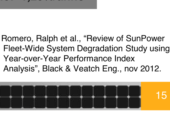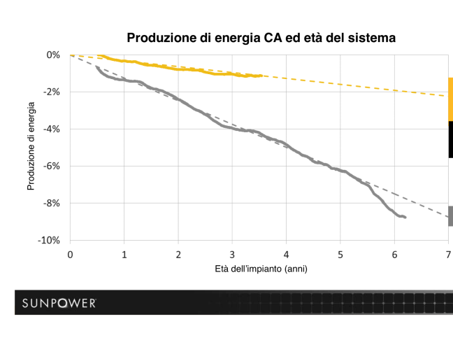 Se vuoi sapere esattamente quanto ha perso negli anni un pannello solare lo devi portare in un laboratorio specializzato in queste misure dove viene irradiato con una fonte di luce calibrata e si misura quanto produce incondizioni standard. ma chi lo fa ? altrimenti cerchi di stimare quanto produce mettendo il pannello perpendicolare al sole e misurando volt e ampere. ho montato da poco due pannelli da 100W e finora li ho provati solo per 5 minuti col sole basso a 30 gradi. Ho fatto il calcolo di quel che producono considerando l'inclinazione del sole e misurando volt e ampere ed e' uscito che producevano il giusto secondo i 200W della loro potenza. secondo me una stima in base ad amperaggio e voltaggio e' valida. qui un grafico sulla degradazione in potenza di pannelli solari sunpower (grafico giallo) e pannelli convenzionali (grafico grigio).