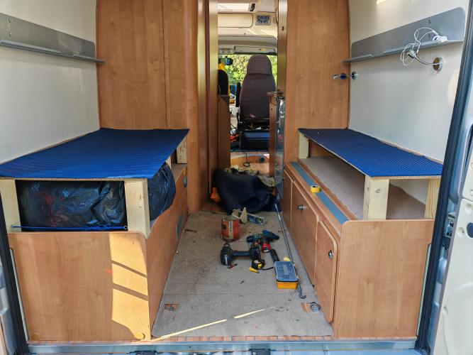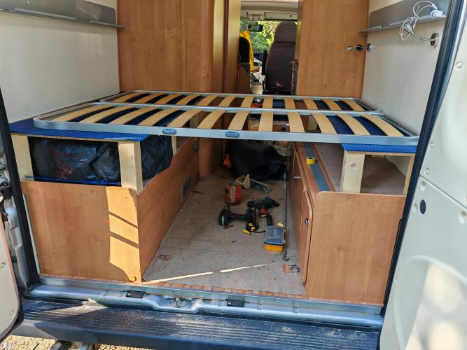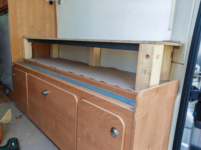 Eh si, finalmente dopo 6 anni di Van, senza ruota di scorta, per l'impossibilità di piazzarla da qualche parte, mi sono deciso ed usando un po' di materiale di risulta ho fatto questa modifica. Ho eliminato il letto superiore,perché siamo rimasti in due. Ho rialzato di circa 23cm il letto inferiore, per poter mettere la ruota di scorta. Più avanti, se sarà il caso, sostituirò il laminato truciolare, che fa ******, ma questo avevo... Con un multistrato. Tempo di realizzazione circa 2 ore. Ogni critica costruttiva è suggerimento è ben accetto. Gianluca Il Paradiso può attendere....., il Fritto no...!!