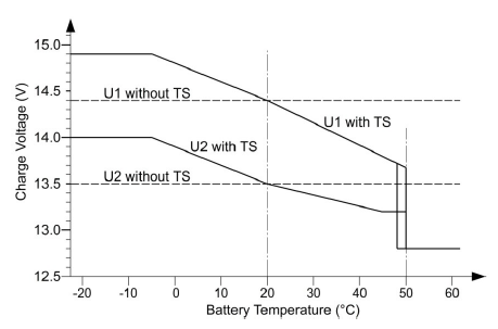 Ho scritto 15v (esattamente sarebbe 14,9v) perchè riportato dal manuale, ma in effetti sono quasi sempre 14,5v, qui misurato sulla BS con motore in moto appena acceso La tensione di carica per batteria AGM è questae regolata da una sonda di temperatura posta sulla batteria, quindi il massimo è 14,9v @ -20° e quindi direi quasi teorico visto che la batteria è in gavone riscaldato, e poi solo nella prima fase della carica U1 (14,4v @ 20°) ma poi passando a U2 la tensione cala molto (13,5v @ 20°). Non ho misurato la tensione sui morsetti del frigo, ma se la tensione della BM con motore avviato è di 12,8v (sale solo in alcuni momenti quando l alternatore riprende a caricare) , sicuramente non puo essere maggiore, semmai inferiore.