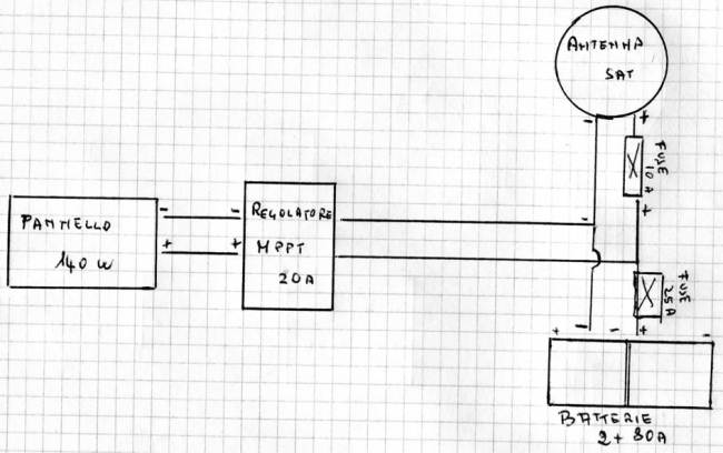 Grazie di nuovo a tutti per le risposte. Per un ignorante in materia come me siete una risorsa ...ma anche fonte di perplessità. Sul mio mezzo c'era la predisposizione per il pannello su cui il concessionario ha collegato(oltre,ovviamente, le BS) l'antenna satellitare montando un fusibile da 10 A. Ora sto terminando l'installazione dell'antenna secondo lo schema allegato; prima di riattaccare le batterie gradirei un vostro parere. Salutoni Desiderio