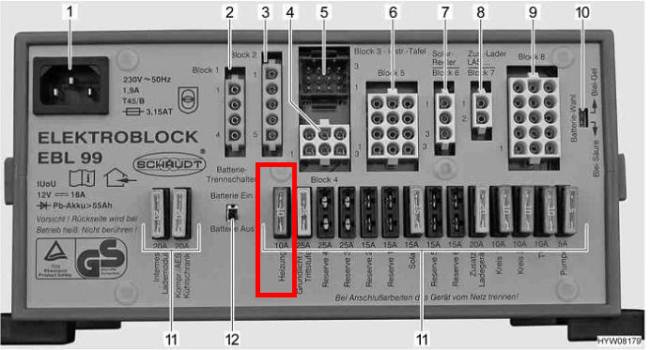 Marta, il fusibile incriminato è quello (evidenziato in rosso heizung = riscaldamento) sulla centralina elettrica del Camper: mentre i fusibili ritardati (in vetro) sono sulla scheda elettronica della stufa (foto sopra) ... Ciao, Cesare