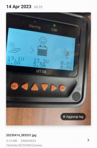 Concettualmente non sbagli, ma è un dubbio teorico. Alle 7 del mattino i 12V già producono. La tensione sale in fretta appena il sole lambisce il pannello, è la corrente che poi aumenta man mano. Inoltre i minuti al mattinomolto presto e alla sera molto tardi (relativamente al sole, intendo) ai fini dell'energia giornaliera accumulata contano davvero poco, essendo comunque le correnti basse. Anche per quello dei pannelli più sensibili allo spettro di luce di mattina e sera non importa molto, che tira su il totale sono le ore centrali. (Secondo me .. sai quando si è sul mare e non si ha niente da fare, si fa anche le statistiche di quanto sta producendo il FV) (Ora guardo se ho in memoria una foto del pannello regolatore fatta alle 7 di mattina, tanto come esempio) PS No, qui su cellulare di fatte alle 7 del mattino non ne ho, forse tra quelle salvate sull'HD del PC. D'altronde è già qualche anno che non documento più le prestazioni FV. Ho qui questa foto fatta in Francia centrale, in aprile alle 8 e 35 .. sono cmq 5.5 A di carica In estate al mare, come dicevo, alle 7 già ricaricano. Comunque io non è che voglio convincere nessuno ai 12V eh! .. se uno ne trova a 24 V che gli vanno bene, perfetto! L'importante è stare su con la W. Ritengo invece che sarebbe sbagliato prendere ad es. un 180 W perché a 24 V rispetto a un 200 W a 12V.