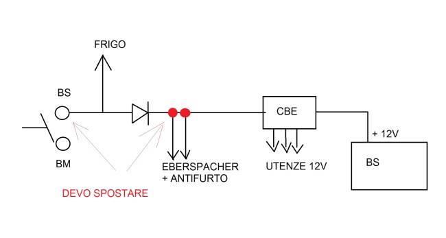 Marco, secondo me anche prendendo la corrente direttamente dalla BM come la tua soluzione prevede sarà ancora la BS ad alimentare parzialmente il frigo. Adesso il frigo viene alimentato in moto circa 40% dalla BM e 60% dalla BS. Lo so perchè ho uno shunt vicino alla BS. Il frigo pesca subito dal morsetto BS del parallelatore che si trova a poco più di un metro dalla BM La tua soluzione è ottima per innalzare la tensione di lavoro del frigo e dunque l'efficienza ma non è quello di cui ho bisogno. Nel mio caso mi trovo con una BS che mantiene una tensione più alta di quanto fornisce l'alternatore sotto carica. Usando il tuo circuito mi cambiano solo le cadute di tensione su circa 2 metri ( tra parallelalore e BM ) nel cavo da 10 mm2 che per correnti di 5..6 A sono al massimo di 0,05 V...... la BS continuerà a prevalere. Se mi sbaglio caxxiami pure .....