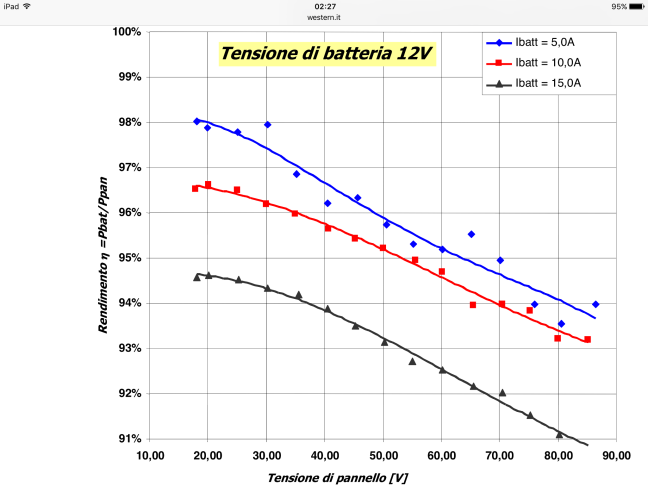 Un utente del forum tedesco ha misurato l'efficienza del mppt victron 100/50 a 40A ed e' risultata del 97%. non credo che molti regolatori hanno valori simili. Ora chiedo al tedesco che voltaggio hanno i pannelli usati da lui. qui ad esempio il grafico del tanto lodato western wrm-15: