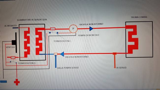 , volevo aggiungere un pezzo in più al camper e cioè uno scambiatore collegato all'eberspacher per avere l'acqua sanitaria calda durante il funzionamento del motore in marcia o con il riscaldatore durante la sosta.