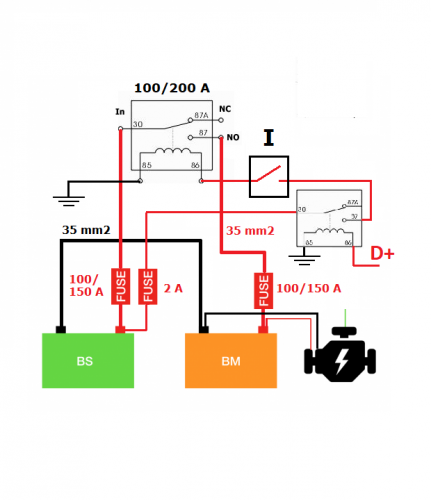 Si, Antonio, hai ragione ... 1 relè solo può bastare anche se devi tenere presente che la bobina del relè da 200 A consuma circa 600 mA che non sono pochi per cui un altro piccolo relè non è malaccio ed evita di prelevarei 600 mA sulla linea del D+. Necessità di corrente ? tutti litigano per questo... ci sono apparecchiature che costano migliaia di € , bruciano litri e litri di gasolio e/o metanolo per produrre pochi amperora. ,a mio avviso tecnicamente interessanti, obiettivi e istruttivi, quando esistono alternative valide ( con determinati impianti ... ho scritto in specifico per Marco che ha BS al litio ) realizzabili con costo quasi nullo ...