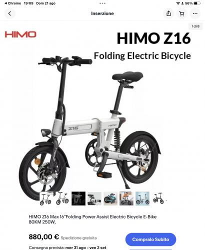 Io ho 2 himo z16 ficcate in 2 borsoni ( vedi immagine) sotto il letto del van. Il prezzo è molto variabile, dipende dal container she sbarca. Hanno il difetto della mancanza del cambio ma una salitella la fanno. Sono bloccate a 25kmh