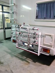 Ciao a tutti. I bambini crescono e le bici pure, in numero e dimensioni. Sto pensando ad una soluzione solida ed affidabile per trasportare esternamente le bici evitando di sollecitare la parete posteriore. Le soluzionisono:Portamoto con canaline per bici: costosa! Gancio traino con portabici applicato su di esso... Portabici attuale con saette inferiori vincolate al telaio Ed in ultima, quella che più mi convince, portabici fissato al telaio e non collegato alla parete posteriore, come le foto sotto. Ciò che non so, e sto aspettando in merito risposta da una ditta che realizza ciò, è la necessità o meno di omologazione e/o collaudi?. Il camper è un Adria su cui libretto sono riportate le seguenti indicazioni. Qualcuno nel forum ha qualcosa di simile montato sul mezzo? grazie Edo & Manu