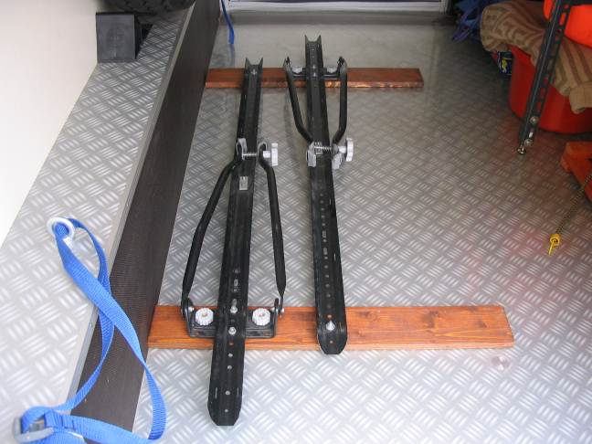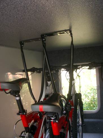 Ho risolto il problema riciclando dei vecchi portabici da tetto da auto, avvitandoli su 2 assette di legno e sono solo appoggiati sul pavimento del garage. Ciao Fabio