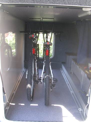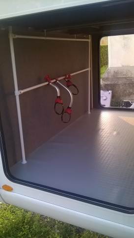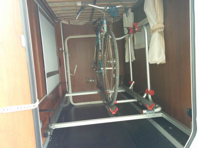 Se hai le bici pieghevoli, potresti sfruttare la piegabilità come ho deciso di fare sul nuovo camper: io ho fatto anche il doppiofondo, ma anche se non lo vuoi fare, in questo modo le due bici occupano in larghezza circa1/4 (o comunque meno di 1/3) del garage e a queste è dedicato il portello destro, mentre il resto del garage è vuoto e accessibile comodamente dall'altro portello. Tommaso IZ4DJI www.iz4dji.it