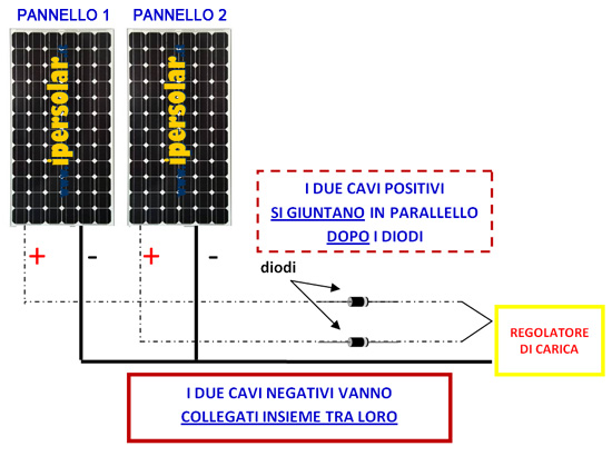 Ok , li collego in parallelo: ho acquistato il regolaotre victron che prevede una sola coppia di morsetti pannelli -75-15-&-MPPT-100-15-EN.pdf e sto aspettando questo diodo vorrei evitare di fumare il tutto , chimi conferma cortesemente il collegamento sottostante ? P.S questi esperimenti prima delle ferie mi mettono un pizzico di Phatos grazie per la pazienza Ci sono solo due giorni all'' anno in cui non puoi fare niente: uno si chiama ieri, l'' altro si chiama domani, perci� oggi � il giorno giusto per amare, credere, fare e, principalmente, vivere. (Dalai Lama)