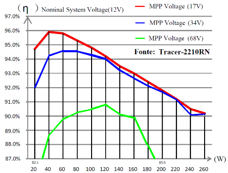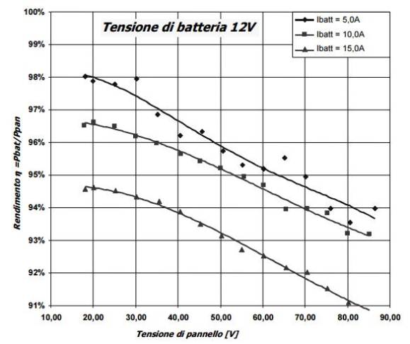 Ciao, solo per il piacere di scambiare opinioni senza nessuna pretesa di fare il maestrino (atteggiamento che non mi appartiene in genere e specialmente quando si tratta di una materia che coltivo solo per hobby) posto undiagramma preso dal manuale del WRM15. Stando a questo grafico, contrariamente a quanto ci diciamo di solito, il rendimento diminuisce all'aumentare della tensione del pannello e della corrente. Sarebbe interessante sapere se è così per tutti i regolatori. Per quanto riguarda il collegamento in parallelo di due pannelli di voltaggio molto diverso con i loro diodi di blocco, credo che il pannello di tensione inferiore non contribuirà alla produzione di energia perché il diodo non potrà condurre visto che il catodo vedrà una tensione positiva maggiore di quella dell'anodo.