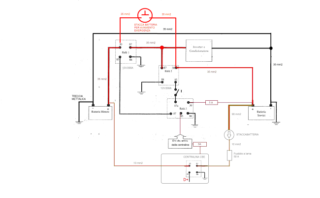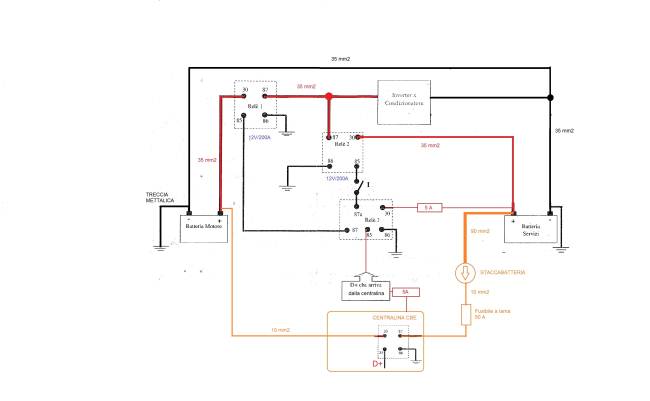 Magari i relè si rompessero. Il carico pesante potrebbe saldare i contatti elettrici con le conseguenze che si possono immaginare. Io accendo il camper in emergenza con questo schema qui ma usando il grosso relè presentesul motorino d'avviamento, il resto si fa con commutatori manuali (due) che sopportano 500 ampere. Ecco lo schema generale: Ma la mia Power Box è questa e qui si vedono i due commutatori ( S1 e S2 ) che collegano una o entrambe le BS alla BM La BM se è in corto posso staccarla da S4 e alimentare l'impianto con le due BS. (il resto dello schema ignoralo...) Marco.