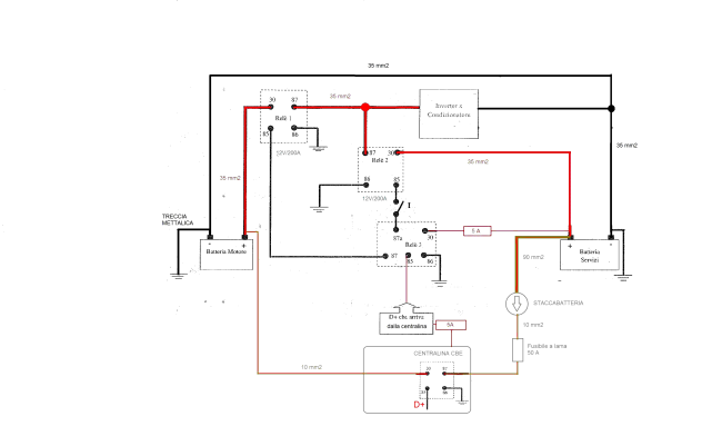 Ma no..... La mia BS non ha nessuna difficoltà nell'erogare la corrente necessaria all'inverter. Anche a motore spento. Collegando l'inverter sulla BM non sarà più utilizzabile da fermo. La cosa buffa è che il concessionarioè convinto che con il motore in moto la BS con quella soluzione sia staccata dall'inverter. Non si tiene in conto che è un impianto messo in parallelo a quello originale e se la BS prevale sull'alternatore una buona parte della corrente necessaria all'inverter sarà data dalla BS malgrado l'assenza di collegamento diretto. La corrente farà il giro lungo passando dal relè parallelatore che , come hai scritto, è grosso come uno zuccherino.