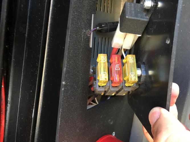 Da questo deviatore escono 5 cavi rossi. 2 vanno alle due batterie, 1 non l'ho individuato, 1 dovrebbe essere l'alimentazione in entrata e l'altro va ad un altro stacca batteria manuale collegato ad un inverter.