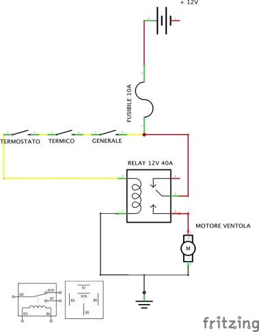 @Matrix: non c'è problema, domani pubblico uno schema che purtroppo sta su un portatile che è rimasto in ufficio. I pezzi te li elenco al volo: (eventuale) portafusibile e fusibile da 10A - se non li hai già - interruttoretermico NORMALMENTE APERTO da 40°C (fino a 60°C va benissimo), cioè deve chiudere il circuito sopra quella temperatura e riaprirlo al di sotto. Ho indicato un link su ebay sopra, altrimenti negozi di idraulica... personalmente dico online, risparmio un sacco di tempo e non poco gasolio. Costo circa 5€ - termostato a batterie (NON alimentato a 230V, anzi se vuoi di questi te ne regalo uno ) che consiglio giornaliero, settimanale complica solo la vita per questo impiego. Ho trovato un ottimo prodotto nel CH110 della Fantini Cosmi, disponibile in 3 colori (bianco, nero e grigio alluminio che ho scelto) per circa 25€ - relay o relais o relé 12V normalmente aperto o a doppio scambio (NA+NC cioè a 4 o 5 contatti) tipo che puoi anche trovare corredati di cavi di cablaggio. Facili da trovare presso autoricambi, costano circa 5 euro. - interruttore generale per spegnere il tutto, che dovresti già avere - a parte che se chiudi il rubinetto e non fai scaldare il radiatore, grazie all'interruttore termico è già tutto spento... Ti serve poi un tratto di cavo doppio (basta da 0,75 o 1mm2) per la linea al termostato (ci vuole una coppia) e cavo singolo per la linea che pilota il relè. Costo indicativo 0,3-0,5 €/m esempio: Negozio di elettronica o autoradio, anche autoricambi IMPORTANTE: NON ripeto NON usare questo cavo per alimentare la ventola, limitati al circuito di comando del relè. Il circuito di potenza ha correnti ben maggiori dove quel cavo è SOTTODIMENSIONATO e devi usare un ben più robusto 2,5mm2 o superiore (con fusibile!!!!). Altra cosa importante: valuta bene dove mettere il termostato, che scalderà la cellula basandosi sulla temperatura di quel punto... quindi centro cellula, lontano da spifferi e punti caldi, però comodo da raggiungere ed esteticamente... vedi tu! Minuterie: faston o capicorda isolati con relativa pinza a crimpare (negozio di elettronica se li vuoi buoni, altrimenti per una/due volte che li userai basta il negozio cinese), forbici per tagliare/spellare i cavi elettrici, nastro isolante e qualche fascetta... mi pare basti così Quindi ti devo solo lo schema, che pubblicherò domani (spero!) Roberto Laika Kreos 3002 (35C17-2005)