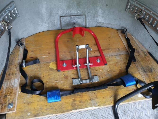 io ho risolto così, fatta una base su misura in multistrato da carpentiere, è molto robusto, è solamente appoggiata fisso i blocca ruote al multistrato dove mi serve con una cinghia tengo solamente in equilibriola moto, il blocca ruote rosso e per cerchi piccoli, quello nero grandi, così non ho rovinato nulla e per ribaltarsi la moto, o le moto ( ne posso caricare due ) si deve capovolgere il pannello, secondo me questo sistema è molto più sicuro