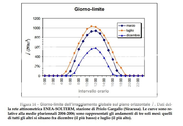 Il tuo intervento, Marcucciolo, mi pare piuttosto dubitativo sui 7A che ho riferito. :) No problem ... per quel valore sono andato a memoria (non l'avevo annotato) e potrei anche sbagliarmi, anche se non mi pare. Però faccionotare che nelle ore centrali della giornata l'irradiazione sale parecchio come intensità e se poi si è a latitudini meridionali anche l'angolo di incidenza si porta verso lo zenit e il famigerato cos(α) che fa calare la produttività di un modulo piazzato orizzontalmente si porta verso l'1. Ma al di là di considerazioni generiche, riporto come esempio questo diagramma sperimentato dall'Enea in una stazione siciliana e (NB) già riferito alla superficie orizzontale da cui si vede che l'irradiazione I' su un pannello orizzontale in ore centrali estive può stare anche sopra i 1000 W/m^2, che è poi l'irraggiamento standard di collaudo dei moduli FV, non il massimo possibile. Magari nel sud di Creta (dove tornerò anche quest'anno), con aria pulitissima e qualcosetta ancora in meno di latitudine, I' potrebbe anche essere un po' maggiore e in tal caso la corrente max. possibile sarebbe, per quelle ore, anche maggiore di quella Iwmax contenuta sui data sheet (che per questo modulo è 7.26 A) Comunque una volta là non mancherò di fotografare il display che mostra corrente e tensione, per confermare o meno la cosa il più oggettivamente possibile :)