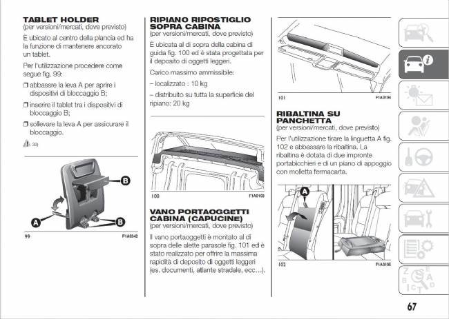 Delle varie soluzioni anche meno costose (vaschetta, sportello semplice cioè solo incernierato da un lato, ecc) quella del leggio mi pare la meno utile o pratica e più cervellotica. E poi, dato che il Ducato non viene vendutosolo ai corrieri che devono infilarci i DDT ma anche ad allestitori di camper e ad altri utilizzatori, potevano almeno farlo fissato con 4 viti da sopra e asportabile senza smontare il frontale con annessa radio, magari fornendo a parte alternative funzionali facilmente intercambiabili tipo appunto una vaschetta portaoggetti e simili. .