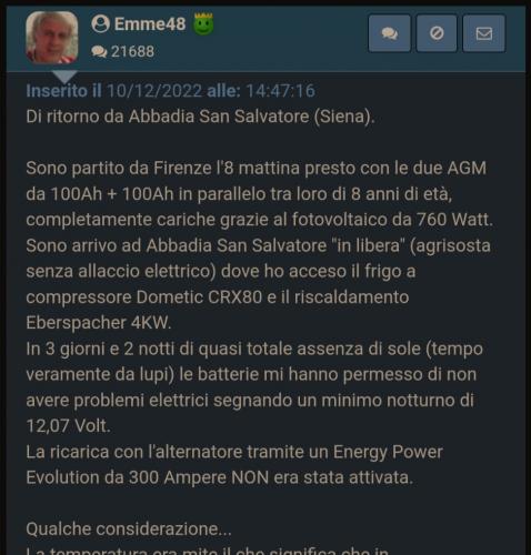 Di ritorno da Abbadia San Salvatore (Siena). Sono partito da Firenze l'8 mattina presto con le due AGM da 100Ah + 100Ah in parallelo tra loro di 8 anni di età, completamente cariche grazie al fotovoltaico da 760 Watt.Sono arrivo ad Abbadia San Salvatore in libera (agrisosta senza allaccio elettrico) dove ho acceso il frigo a compressore Dometic CRX80 e il riscaldamento Eberspacher 4KW. In 3 giorni e 2 notti di quasi totale assenza di sole (tempo veramente da lupi) le batterie mi hanno permesso di non avere problemi elettrici segnando un minimo notturno di 12,07 Volt. La ricarica con l'alternatore tramite un Energy Power Evolution da 30 Ampere (massime) NON era stata attivata. Qualche considerazione... La temperatura era mite il che significa che in riscaldamento ha consumato... più corrente, già! Se fa freddo l'Eberspacher si posiziona a potenza/rumore/consumo (elettrico e di gasolio) minimi e non ci sono praticamente mai cicli di spegnimento e riaccensione che sono quelli che consumano tanta energia elettrica. Con la temperatura mite e l'ottimo isolamento del monoscocca in vetroresina, il riscaldatore non riusciva a stare al minimo senza scaldare troppo e doveva per forza iniziare il ciclo di Stop e dopo un po' di tempo ripartire con un ciclo di Start, questo consuma molta energia più elettrica che lavorare al minimo ininterrottamente. Luci a LED la sera e il PC (per vedere 3 film) che ha lavorato pe 4 ore con inverter Victron, più i soliti caricabatterie ecc... Oggi le batterie erano un po' fiacche, così per prova ho attivato l'Energy Power Evolution a motore in moto ed ho notato che al minimo ricaricava dalle 5 alle 8 Ampere, non di più, mentre accelerando la corrente sulle BS raggiungeva i 30 Ampere, quindi ricaricare con l'alternatore ha senso solo viaggiando e non da fermi, almeno nella mia configurazione di alternatore Mhale da 80 Ampere. Credo che col solo fotovoltaico, seppur da 760 Watt, non si possa andare oltre, ipotizzo che la carica delle BS mi avrebbe permesso circa 5 giorni e 4 notti col sole quasi assente ma comunque capace di ricaricare ben più di nulla. Ulteriori possibili implementazioni per produrre energia in sosta libera? Mi viene in mente l'Efoy e l'eolico che con le ventate di stanotte mi avrebbe permesso di alimentare tutto il paese. Dovrò informarmi meglio nel mondo nautico (amici di Cecina Mare) circa il funzionamento dell'eolico di piccola potenza. Marco. Marco