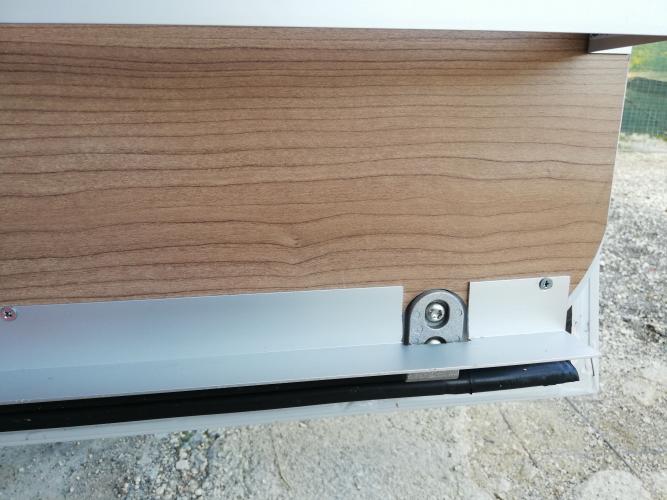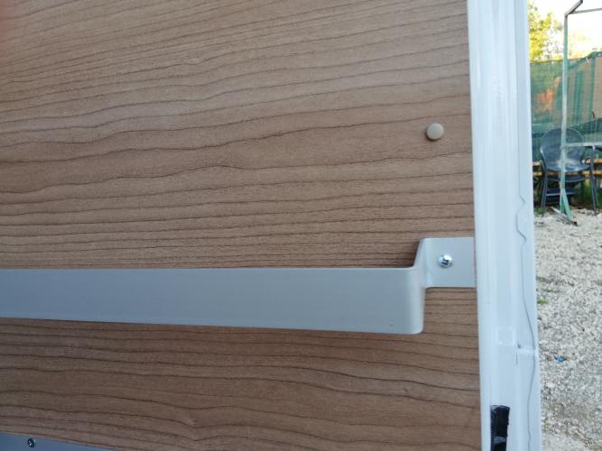 Detto e fatto. Ecco il mio tavolo attaccato al portellone. Il costo dell'accessorio? circa 10 euro al Brico. E' stato sufficiente inserire un angolare in basso, utilizzando i fori delle viti originali, ma mettendo vitisvasate e sagomare una piattina di alluminio per reggere il tavolo. La cosa può essere completata con una cinghia di fissaggio e dei gommini da mettere nell'angolare d'appoggio, in modo da evitare rumori dovuti a vibrazioni. Ecco i particolari dell'angolare in basso E della piattina in alluminio. Tempo di realizzazione circa mezz'ora. Peccato che nel portellone sinistro non ho spazio per le sedie, ho solo 5 cm di spessore possibile.