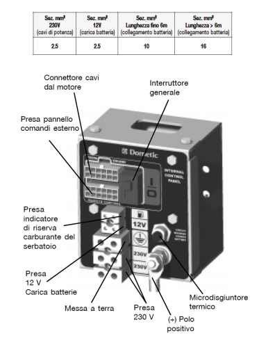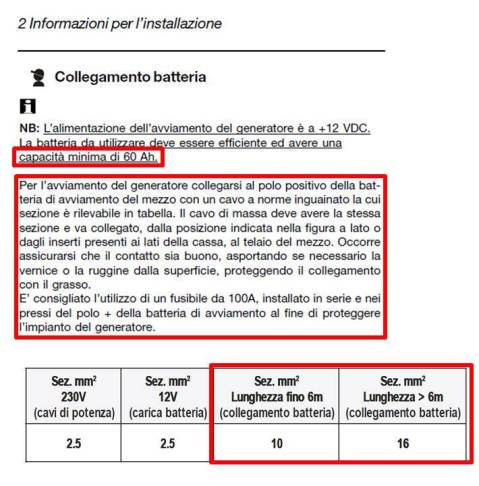 condivido il collegamento sulla BS solo se il TEC è libero di accendersi alla necessità, ovvero quando vi è ancora energia per metterlo in moto, momento in cui di sicuro la BS non è certo scarica, momento in cui in invernodurante la notte in libera sicuramente si accenderebbe... non proprio carino. guardate qua: Faccio notare la richiesta del costruttore di 60Ah per la messa in moto.... pensate che la vostra BS quando scarica li abbia? Tornando sul discorso collegamento, guardate in tabella la sezione del cavo richiesta.... ragazzi, come sempre vi dico le cose come stanno, poi siete liberi di fare come volete, ma un consiglio dovete seguirlo.... se il vostro installatore usa la BS per la messa in moto, almeno cambiate INSTALLATORE, perché di sicuro non si è preso la briga di verificare tutti i crismi di montaggio MOLTO pericolosi legati a questo accessorio..... www.susezzapasa.it