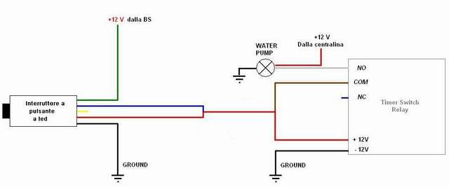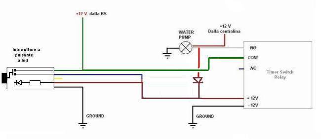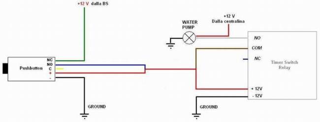 Ciao, L'unico punto di corto mi sembra il pulsante se collegato erroneamente. Comunque il circuito cosi' credo non funzioni. Il 12V non puo' arrivare solo sul pulsante altrimenti quando lo rilasci lo toglie al timer. Mettoil tuo schema modificato: Ho messo lo schema interno del pulsante per fugare qualsiasi dubbio. Spero sia fatto cosi. Il diodo che ho messo (1N4007 o similare) serve ad evitare che la prima corrente che va alla pompa passi dal pulsante e non dal contatto der rele del timer. Se il contatto del pulsante sopporta correnti sui 10A puoi omettere il diodo (ponticello). Come ti avevo detto gia' allora, se alla pompa dai tensione con la centralina, il timer sara sempre sotto tensione, e in questo caso ti si accendera fisso il led del pulsante. Per ovviare devi mandare il positivo del timer verso la pompa tramite un diodo da almeno 6A. Renzo. Renzo.