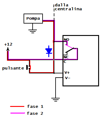 ciao Renzo ora ci siamo , ma a cosa serve il diodo , dato che il positivo al comune è diretto . ho fatto lo stesso lavoro sulla pompa mettendo un temporizzatore con il consenso , comandato da 3 pulsanti normalmente apertoregolabile per diversi minuti ,per evitare di ricordarmi di spegnere la pompa ogni volta , poi ho collegato 2 led led 1 pompa alimentata led 2 pompa in funzione . Aldopalermo76