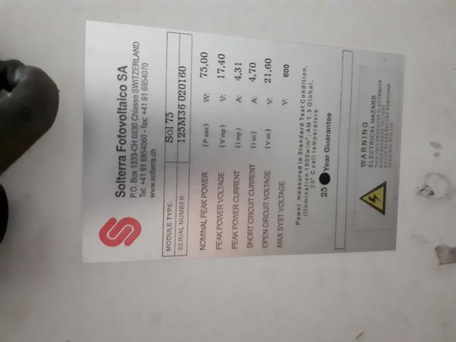 Ho fatto la prova e questo e' il risultato col pannello non collegato al regolatore: con il sole coperto da una nuvola 19,75 volt 1,26 ampere in pieno sole 20 volt 4.42 ampere 14,5 volt all'ingresso del regolatore 13,5 volt all'uscita del regolatore con batteria collegata E' ancora buono? Questo e' quanto scritto dietro il pannello: