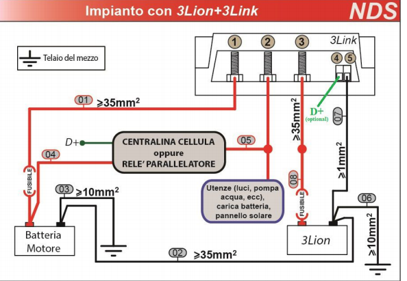 Ciao piluba. Salvo errore, tu sei il primo partecipante al forum ad aver montato effettivamente l' impianto nds e credo che la tua esperienza sara'preziosa . Alcune considerazioni. La battteria e' in grado di assorbire finoa 100 ampere. Questo significa che l' alternatore dovra' fornire - a spanne - una potenza doppia se non addirittura tripla rispetto al normale. Quindi innanzitutto bisogna verificare che l' alternatore del camper sia in grado di erogarla. Giustamente hai portato un cavo da 50mmq (forse anche esuberante, visto che viene consigliato un 35mmq) dalla batteria motore alla batteria servizi. E dall' alternatore alla batteria motore? Il parallelatore e' in grado di reggere 100a? A mio modesto parere - e non e' una critica per te - si potra' montare tranquillamente la batteria al litio, solo quando lo prevedera' l' allestitore.