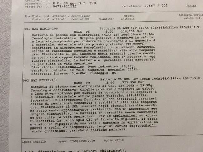 Hai scritto: le hanno ordinate , quando le ritiro posto una foto , so solo che le ho pagate 500,00 euro Poi, due gel 80 ah Bene. Sei il perfetto camperista: se non spende non è contento. Certo, non ho nessun diritto di fare i conti in tasca agli altri, però, due GEL (le meno adatte per un camper) da 80Ah, pagate 500 Euro, è beneficienza pura. Giovanni