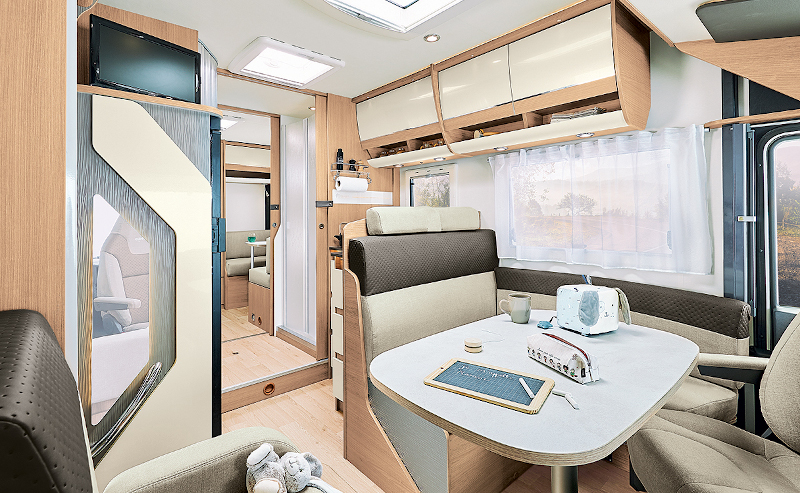 Mi è piacciuta la soluzione di Bimobil in alcuni modelli con due letti gemelli in mansarda e dinette posteriore a U alta sopra a un quasi garage (cioè garage per bici ma non per moto). Certo che per mezzi così bisogna avere vinto la lotteria, ma l idea del layout non è male, molto spazioso e lunghezza ridotta rispetto allo spazio disponibile.