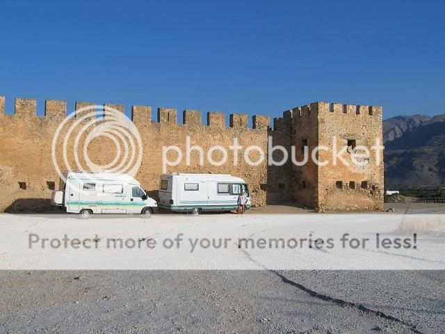 Per la notte eravamo prima parcheggiati in zona più aperta, ma ad un certo punto abbiamo dovuto riavviare e ripararci dietro le mura amiche di Frangokastelo (un tempo il veneziano Castelfranco) per il vento fortissimo a raffiche che spira dalla gole che vedete in parte sullo sfondo, e non ci consentiva di prendere sonno.