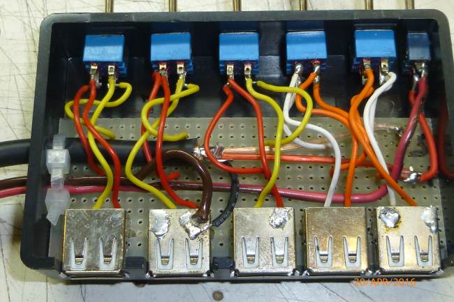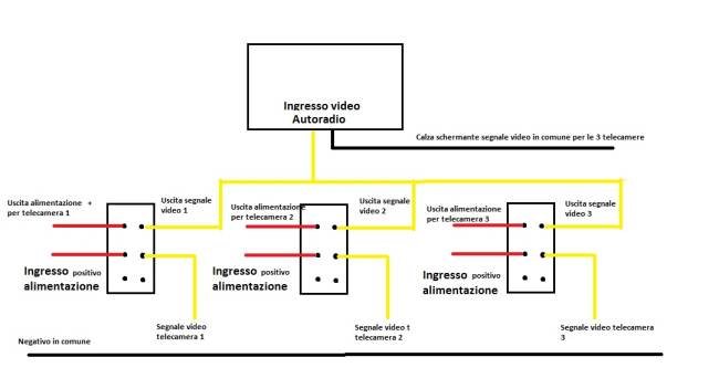 Il rosso (+) va per primo all'interruttore generale (il primo a destra) che accende le telecamere e il monitor. L'uscita (+) dell'interruttore generale (filo rosso), oltre che al monitor (filo rosso del cavetto schermato) passando dal di sotto va a ciscuno degli interruttore doppi, l'uscita di ciascun interruttore va ad un piedino della relativa USB.