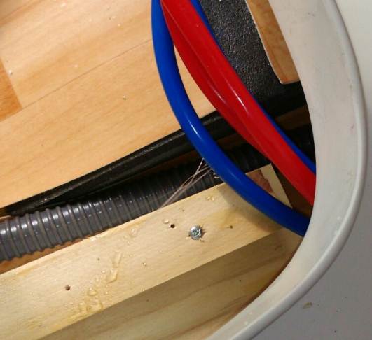 Nella foto si vede la perdita. Pensavo di aver risolto, ma mi viene un dubbio. Sara l'unica rottura? Con del nastro isolante avvolgo il tubo nei pressi della perdita e poi riaccendo la pompa. Altro rumore sinistro ed altro rigagnolo d'acqua che scorre sul pavimento. Anche il tubo che passa nel gavone posteriore e che porta l'acqua calda al rubinetto della cucina ha una crepa.