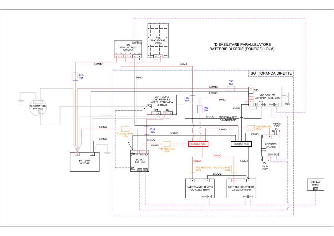 Bonsoir Sto iniziando a progettare l'impianto litio con prodotti NDS, sto studiando a fondo i manuali NDS Dometic e ho iniziato ad abbozzare lo schema di collegamento con dimensionamento cavi e fusibili. Sto optando perdue Tempra da 150Ah, un DCDC da 80A (mio alternatore è da 140A, il minimo consigliato dal manuale), inverter, regolatore di carica e pannello solare 185Wp (il massimo che riesco a mettere sulla parte di tetto a disposizione senza dove stravolgere altro) e caricabatterie da rete 230V. [url= Ci sono utenti con esperienze NDS?