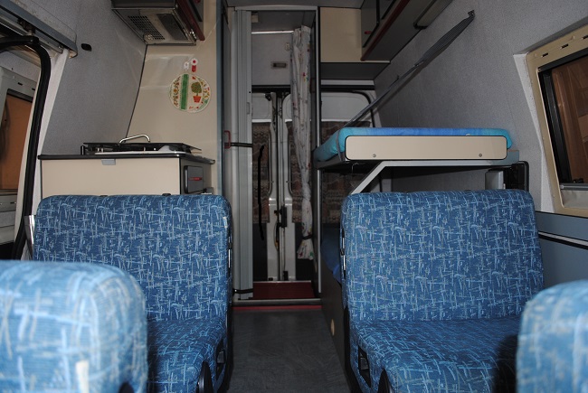 veramente il mio mezzo dispone di 4 letti singoli, due a parete sovrapposti, e altri due ricavati dalla trasformazione di 4 sedili abbattibili che diventano letti, lasciando il corridoio verso il bagno ( in coda ) sempre libero. Quando ci si alza la mattino bastano meno di 5 minti e tutto torna nella normalita'' cioè 4 sedili frontemarcia .