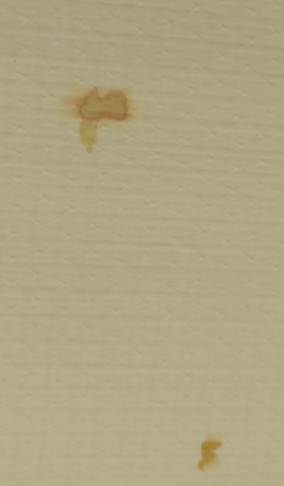 dalle foto vedo che la macchia è bicolore: un centro marrone, un bordo più scuro e degli sbaffi più chiari, come se la macchia si fosse intrufolata attraverso una crepolina dello strato trasparente fin nella trama del tendalino.