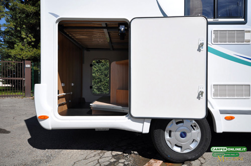 Bhe, il mio essendo più vecchio, ha una sola porta,però ci carico,oltre al resto, tre bici, oppure uno scooter 125, quindi penso che,considerando la tipologia del camper, sia un ottimo gavone.