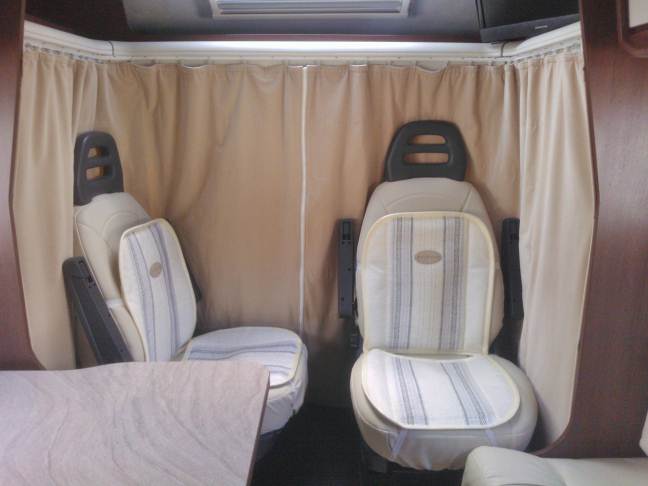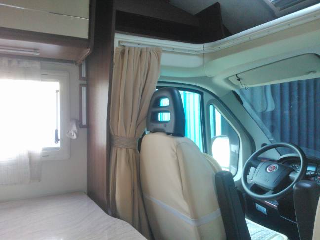 Questa era la mia soluzione Binario attaccato alla parte superiore cabina 2 Semitende appese al binario a doppio spessore in velluto ( leggero ) unite centralmente da cerniera. Le semitende devono arrivare fino al pianodi calpestio della cabina Con questa soluzione avevo risolto il problema degli spifferi. Per non lasciare comunque la cabina fredda, io avevo una bocchetta del vebasto che scaldava l'intercapedine tra tenda e parte vetrata, con quella evitavo anche la condensa ( parzialmente ). Scrivo al passato perchè ora ho venduto il camper e sono in attesa di un'altro, ma le due semitende me le sono smontate e tenute per il nuovo che arriverà. Qui si vede una semitenda chiusa che non ostacola visibilità laterale e neanche la cintura di sicurezza. Ciao