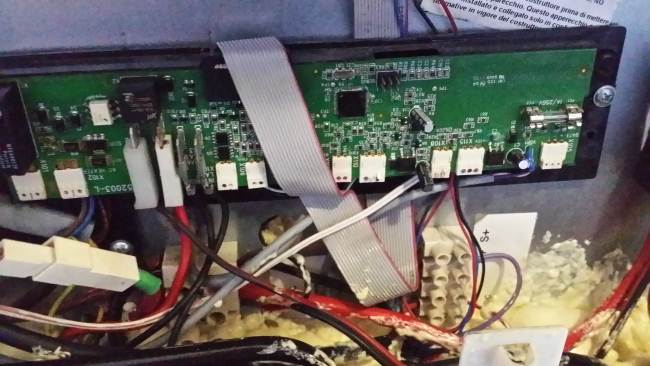 ola Scubidu & compagni, ecco la foto del collegamento il fastom in primo piano e collegato alla resistenza con il filo rosso che arriva dal rele, sulla scheda vicino al cavo rosso quello piccolo e in uscita e va al'86 del rele scusa la schiuma espansa che ho messo per sigillare le ventuali infiltrazioni ha fatto casino Franco