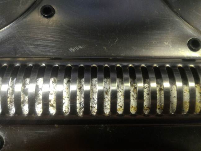 Proprio al centro del piano c'è una griglia (in foto) dove si è accumulato grasso e sporco, e non ho trovato modo di accedervi... svitando le due viti che si vedono, si sgancia il fondo, ma poi tende a cadere verso il basso!