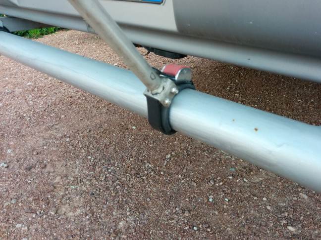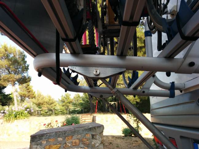 Il tubo al telaio l ho fissato così... Ho provato a salire sul tubo con tutto il mio peso 84kg e il tutto flette poco meno di un cm..... Le staffe sono in acciaio...