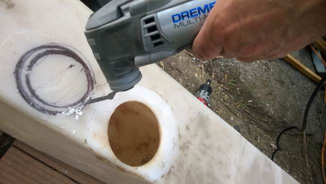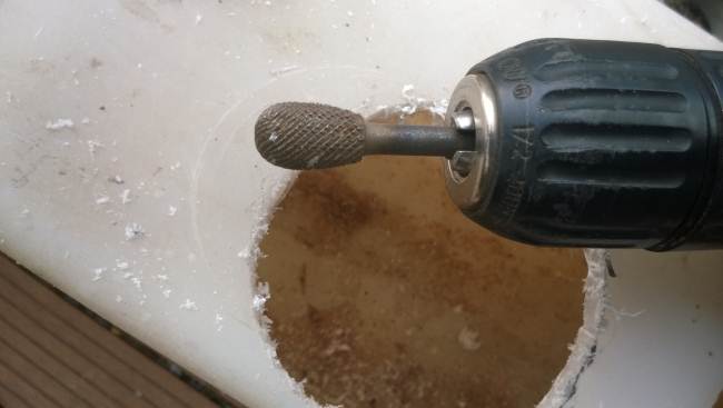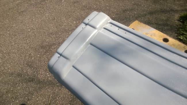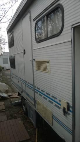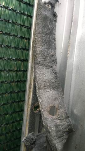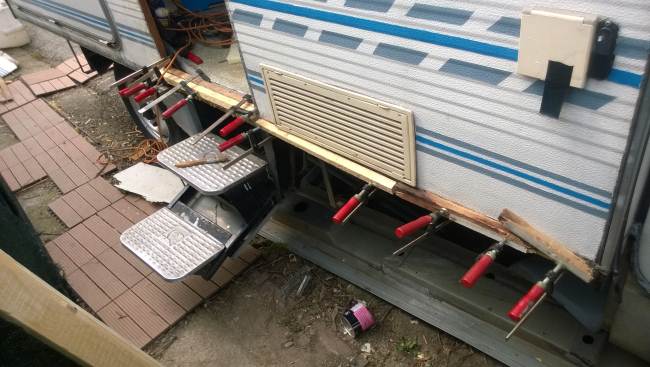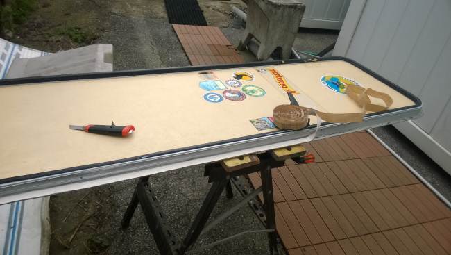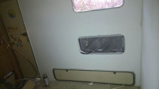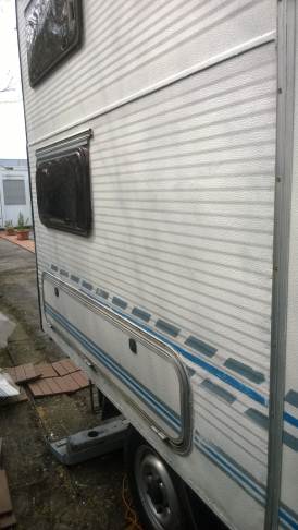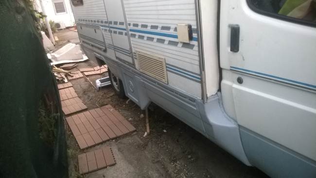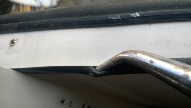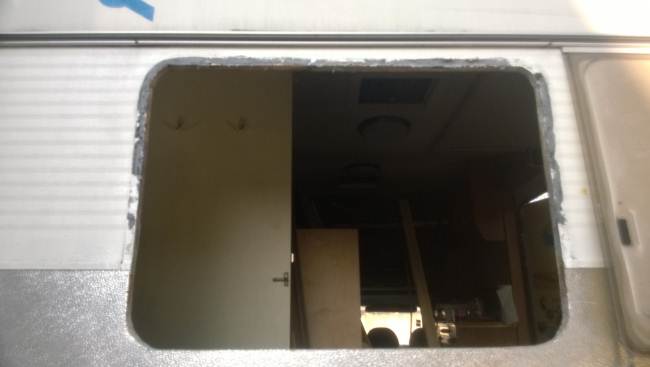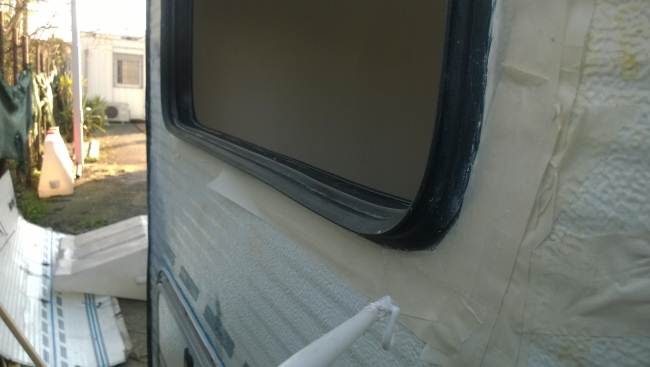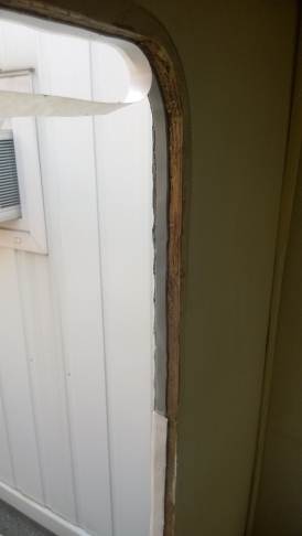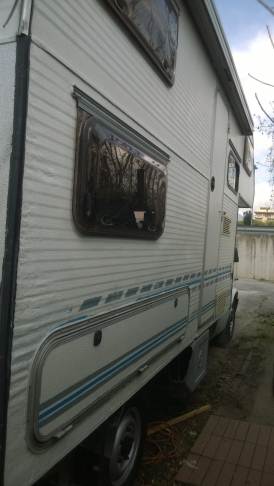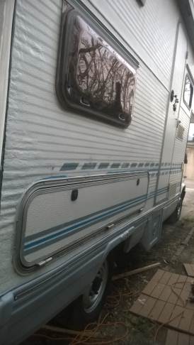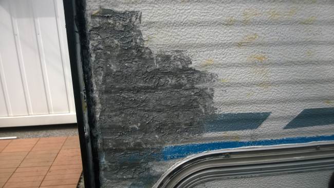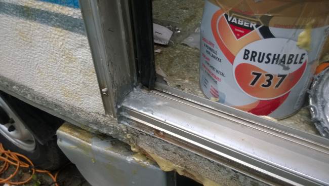La porta di ingresso si era spostata in avanti spinta dalla parete dx quando l'ho smontata per ricostruire la parete e raddrizzare il telaio avevo riscontrato che il sottoporta come tutto il traverso che univa la pareteal piano-pavimento era marcio... Quindi rismonto la porta e inizio ripristino del telaio... sia sotto porta che sul davanti. Solito sistema, elimino travetto marcio, pulisco, inzuppo di consolidante il legno che rimane, inserisco travetto di dimensioni esatte e abbondo con poliuretanica che gonfiandosi garantisce adesione anche se i pezzi non combaciano , ovviamnte come sul precedente, avvito il travetto al telaio in metallo con viti torx adeguate( 4,5x50) dopo aver fatto foro con punta da 4mm . La porta ha un telaio in alluminio ad l ( come il gavone) quindi per sigillare il terostat è adatto. La vecchia guarnizione era una spugnina da supermercato, rinsecchita dal tempo... non ha caso il montante della porta era marcio... Consiglio ha chi ha camper simili di svitare la porta estrarla e risigillare per bene, sostiruendo viti con quelle in inox... I Il telaio è fatto ad U ed in basso ha una traversina da avvitare a chiudere, ma era sigillata con silicone ( ed anque qeullo ha favorito il marcio sotto) Uso per sigillare gli angoli il sigillante in crema da carrozzeria... Sono a lavorare in esterno e tra una cosa e l'altra metto il terostat sull'angolo che copro con guarnizione in gomma, poi metterò angolare alluminio con viti. e sistemo il foro che avevo sigillato in interno con retina e stucco Alluminio ( Roberlo) uso lo stesso stucco, ma devo evitare diventi liscio, con un ritaglio di alluminio goffrato tampono lo stucco per ricreare effetto, viene un po' più su del previsto, ma va bene quando asciutto carteggio e rimane goffrato...più o meno...