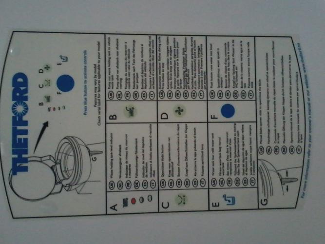 Sono forse uno dei pochi che ha la cassetta thetford col sistema di ventilazione forzata di serie. Ho letto alcune inesattezze sul suo funzionamento. Non è vero che la ventola si attiva solo quando si tira l'acqua, premendouna prima volta il pulsante blu si attiva solo la ventola quindi si può fare prima di aprire la ghigliottina, premendo una seconda volta esce l'acqua. La spia relativa alla ventola è anche un pulsante, premendolo si può fermare la ventola senza aspettare che il timer finisca il suo ciclo. In quel vano sotto lo sportellino c'è un filtro ai carboni attivi che evita di ammorbare i vicini con i nostri effluvi. Thetford dice che andrebbe cambiato ogni anno, il mio ne aveva 11 ma è stato difficile trovare il ricambio, preso su ebay da un venditore francese ma si vedeva chiaramente che è stato in magazzino per tantissimo tempo.